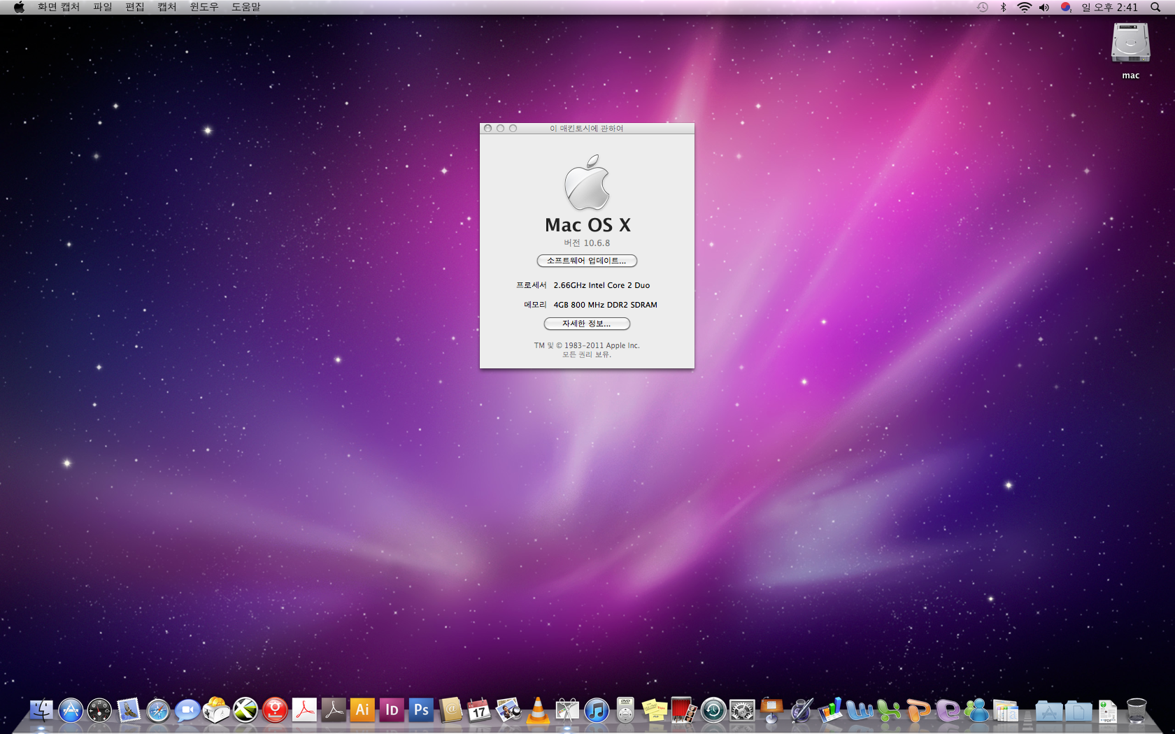 현재 올린 전체화면 사진처럼 스노우레오파드 10.6.8 설치됨