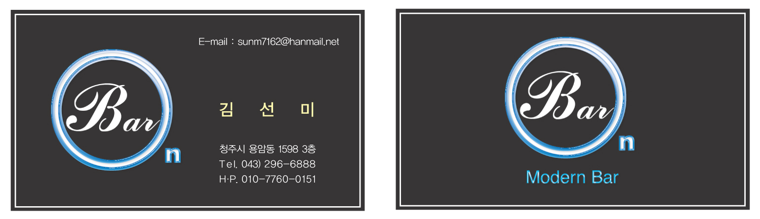 홍콩 명함같은 느낌인데..^^ 직책이나 그런거 들어갔으면 좀 덜 심심했을텐데... 바텐더라던가 그런... 종이는 글라스지 같은 반짝이는 걸로 하면 어울릴듯 싶은데...