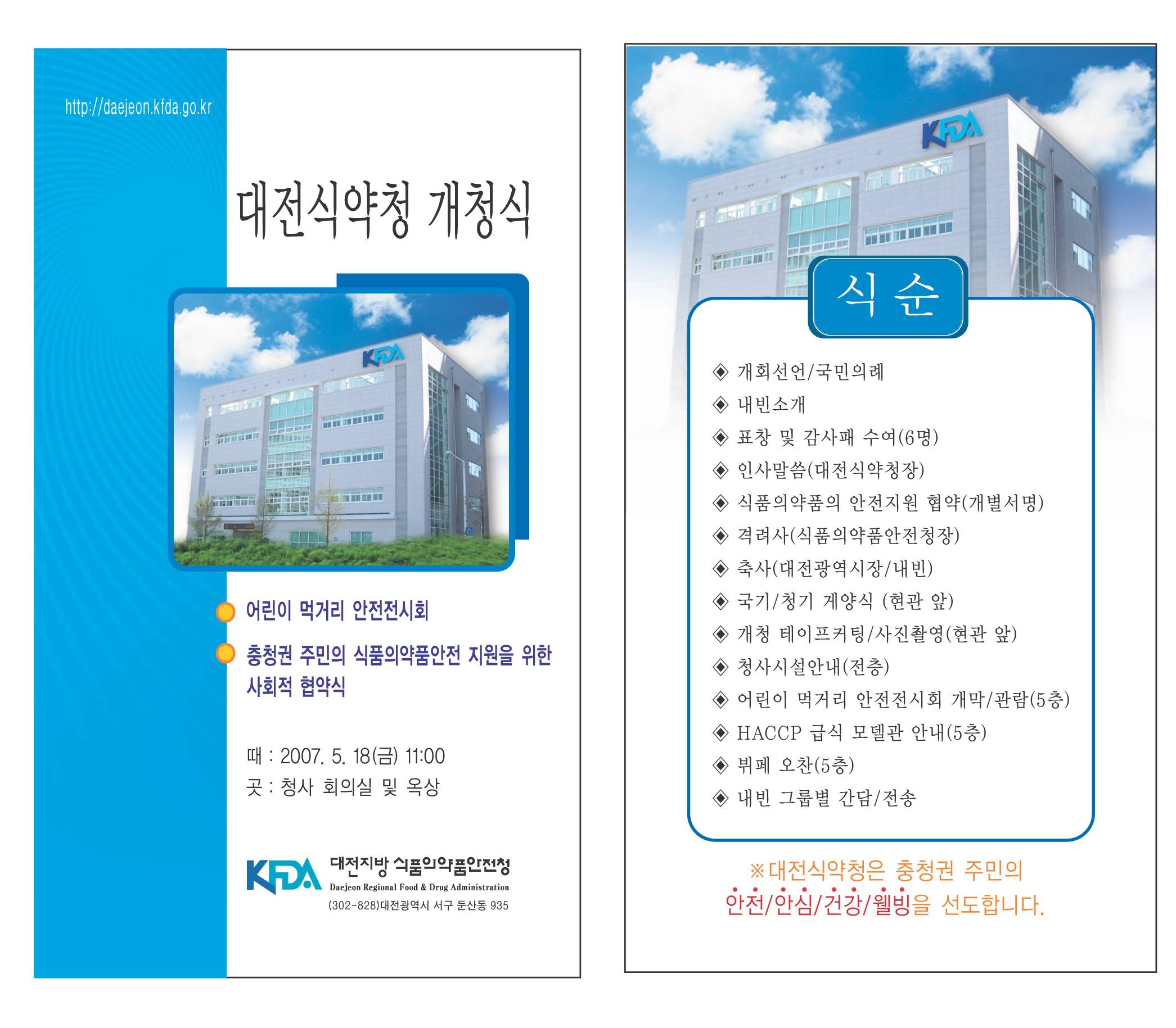 색감이 나 배치는 좋은듯 한데요... 전면 타이틀하고 ... 시간,장소를 때 곳... 이라고 하신것하고 전면 내용중 '충청권 주민의 식품~~~ 위한' 요줄을 자간이나 평좀 줄이셔서 더 집어넣으셨음;;``;;; 뒤에 식순이란 글자 크기도 좀 ...-_-ㅋ;; 에고.. 저희는 오늘도 심심한 월요일이 될듯...