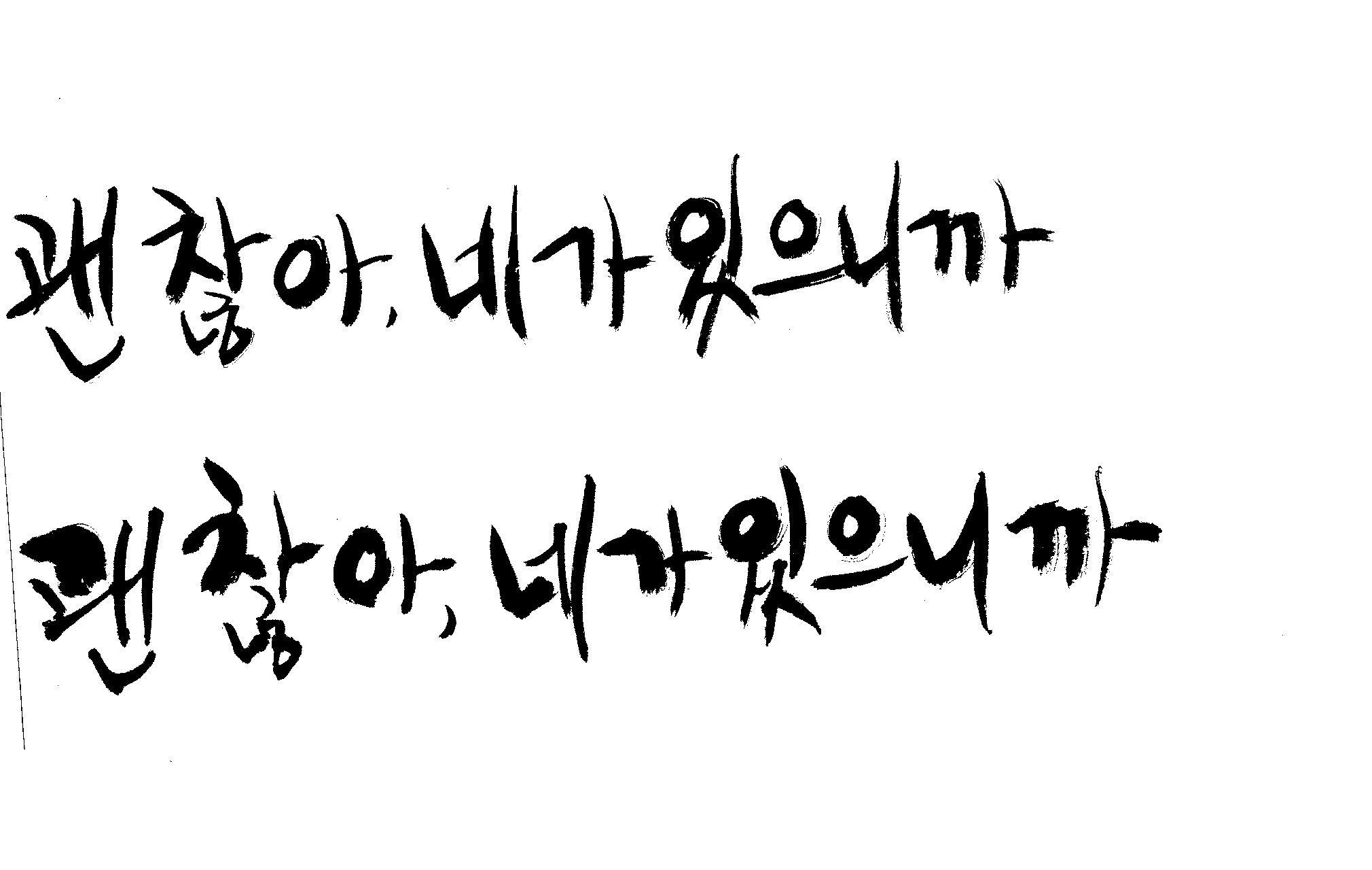 캘리 하나 부탁드릴께요. 김철호 일반 0 7492 2009.01.06 22:48 > > > > > 지금 작업중인 표지가있는데 > > > > 손글씨로 한번 작업해보려구요 > > > > 부탁드립니다. > > > > 괜 찮아, 네가 있으니까 > > >