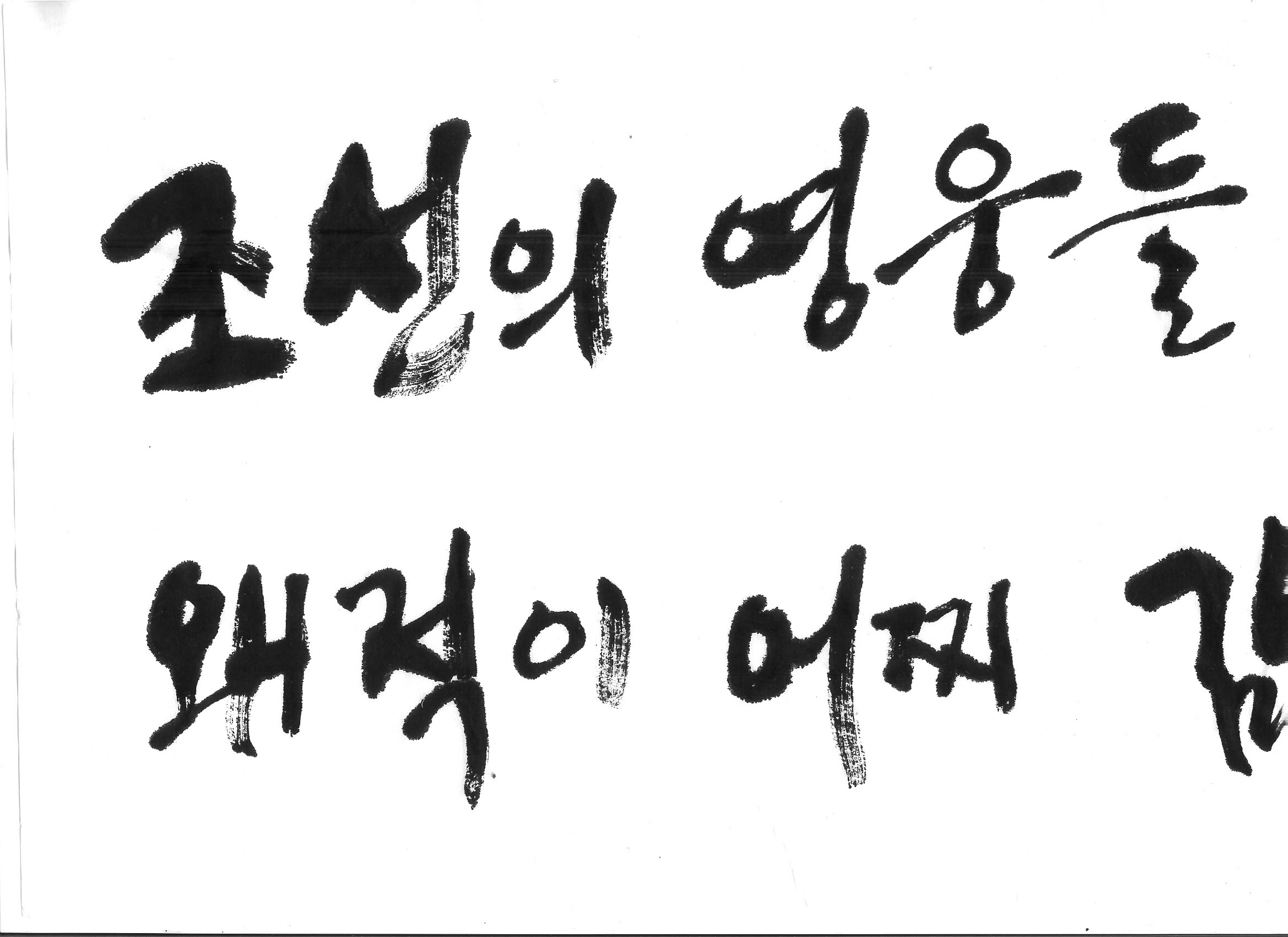 힘찬 캘리 부탁합니다. 김철호 일반 0 13551 2008.09.22 00:49 > > 조선의 영웅들, 천하에 당할 자 없으니 > > > 왜적이 어찌 감히 조선을 넘보리오 > > > > 이렇게 두 문장입니다. > 임진왜란을 주제로 한 캘리인데요. 염치없지만 부탁드려 볼꼐요. >